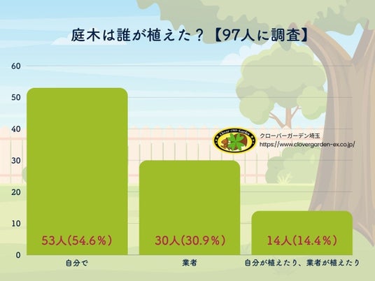 実施した戸建ての庭木植栽に関する独自調査では、97人の回答者のうち、自分で植えた人が54.6%、業者に依頼した人が30.9%、自分と業者の両方が14.4%であることが明らかになりました。