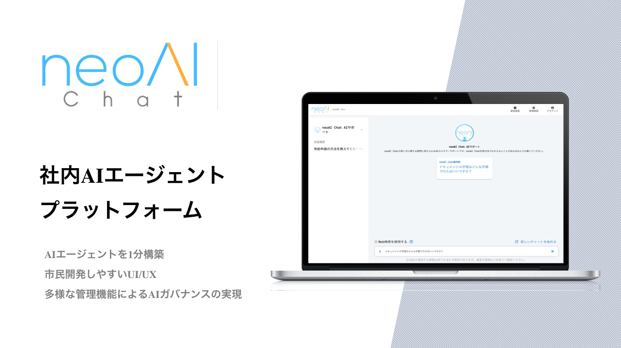 neoAI Chatは、大規模言語モデルによるチャット機能と、業務特化型AIアシスタントの設計・運用をワンプラットフォームで提供する法人向けクラウドサービスです。