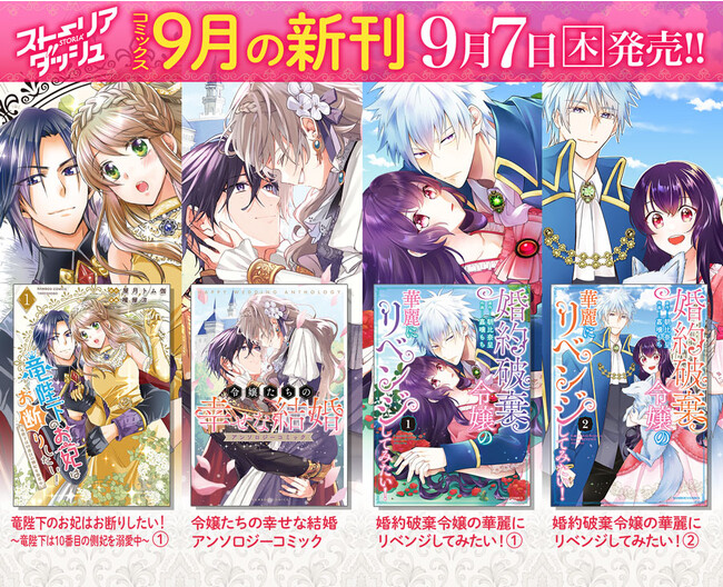 株式会社竹書房「バンブーコミックス」より「竜陛下のお妃はお断りしたい!~竜陛下は10番目の側妃を溺愛中~1.」「婚約破棄令嬢の華麗にリベンジしてみたい!1.&2.」に加え、異世界恋愛を題材とした「令嬢たちの幸せな結婚 アンソロジーコミック」の3タイトルを発売いたします。