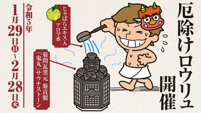松山市と今治市に温泉施設 喜助の湯では、その年製造した「鬼丸・鬼玉」は、 厄除けで有名な今治市菊間町の厄除け大師 遍照院で、厄除け祈祷をして、節分イベントとして日本初の「厄除けロウリュ」 イベントを開催し、ロウリュに使うアロマ水に那気を払う、内子産「じゃばらエキス」を使用して蒸気ととに、サウナ室で汗と一緒に災いを洗い流すイベントは、2022年に4万人が来場した大成功した企画です。