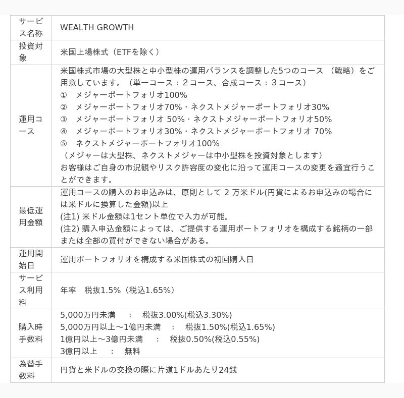 「Wealth Wing」は、個別の株式が持つ様々な要因に着目し投資の意思決定を行うマルチファクター投資を採用していることが特徴で、これまで機関投資家に限られていた高度な運用戦略を個人投資家にも利用できるようにした資産運用サービスです。「WEALTH GROWTH」は、ベンチマークとなるS&P500を上回るリターンを目指すアクティブ運用となります。また、「WEALTH GROWTH」では、保有株式、売買履歴、配当など運用履歴が全てお客様側で把握できる高い透明性が確保されていることも特徴です。