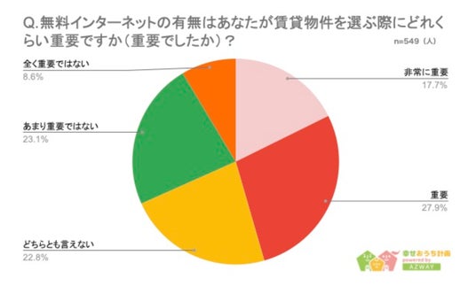 また、「無料インターネットの有無が賃貸選びにどの程度影響するか」について聞いたところ、「非常に重要・重要」と答えた人は250人(45.6%)、「どちらでもない」が125人(22.8%)、「あまり重要ではない・全く重要ではない」が174人(31.7%)という結果になりました。