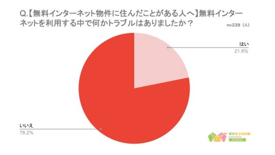 また、これまでインターネット無料物件に住んだことのある238人に「トラブルがあったか」について聞いたところ、「はい」と答えた人は52人(21.8%)、「いいえ」と答えた人は186人(78.2%)という結果に。5人に1人が何かしらのトラブルに遭遇していることがわかりました。