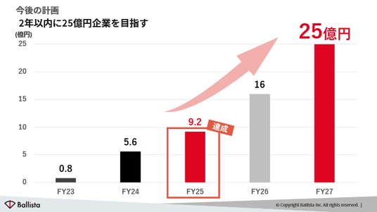 Ballistaは2022年8月にわずか7名で創業し、半年足らずでメンバー数を約5倍へと拡大しました。以降も順調に組織規模と業績を拡大し、創業3期目には売上高9.2億円(前年同期比+64%)を達成。第4期までに売上高16.2億円規模に成長し、2026年の第5期には25.0億円に到達する見通しです。