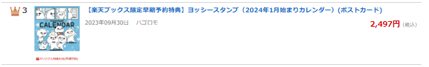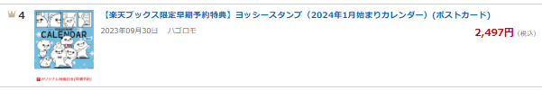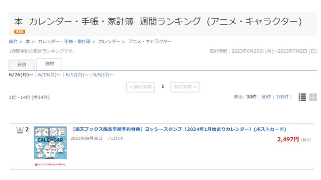 カレンダーの制作・企画・出版を行う株式会社ハゴロモ(本社:東京都千代田区、代表:橘壮太郎)は、「ヨッシースタンプ2024年版カレンダー」が楽天ブックスのカレンダーアニメ・キャラクター部門 週間ランキングにて、5週連続でベスト5にランクインしたことをお知らせいたします。(6/26~7/30集計)