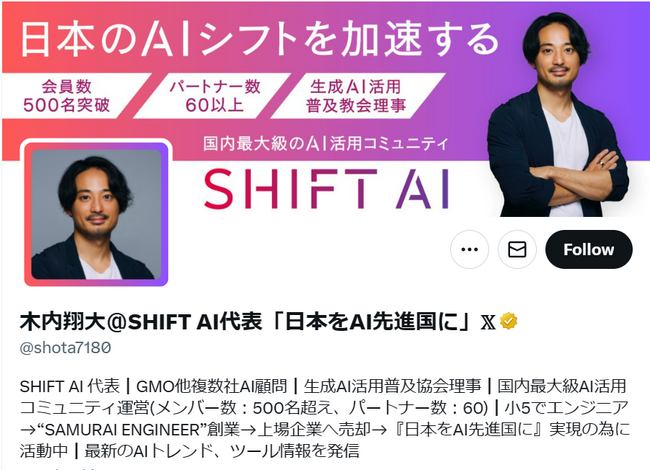 10歳でプログラミングを始めて大学時代はフリーランスエンジニアとして3年ほど活動。2013年に日本初のマンツーマン専門のプログラミングスクール「SAMURAI ENGINEER」を創業。累計4.5万人にIT教育を行い、2021年に上場企業へ売却。2022年に株式会社SHIFT AIを設立し、「日本をAI先進国に」を掲げ、AIのビジネス活用を学べる国内最大級のAI活用コミュニティ「SHIFT AI」を運営。Xを中心にSNSで6.9万人のフォロワーに向けてAI情報を発信。