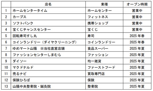 当施設のオープンにより、岡山県内の店舗数は、ゆめタウン6店舗、ゆめマート2店舗、ゆめモール1店舗、ユアーズ1店舗の合計10店舗となります。