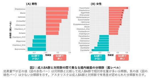 - 成人BA群と対照群で違いのある腸内細菌の種類(分類群)を調べた結果、成人BA群では呼吸器疾患に関連する分類群が多く、短鎖脂肪酸を産生する分類群が少ないという特徴がみられ、腸内細菌叢の構成に異常が起きていることが示唆されました。また、成人BAに関連する腸内細菌の分類群の多くは、男女で異なっており性差が存在していました。