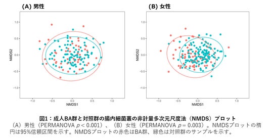 腸内細菌叢の多様性を比較するにあたり、β多様性※4をBray-Curtis指数に基づく非計量多次元尺度法(NMDS)※5のプロットにより可視化し、PERMANOVA※6の検定を実施したところ、男女ともにβ多様性に有意差が認められました(図1)。これは、成人BA群と対照群では腸内細菌叢の構成に違いがあることを示しています。