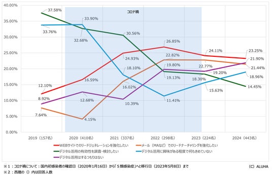 そんな状況下の中、株式会社ALUHAでは、独自に、BtoBマーケティングや営業戦略のデジタル活用の意識調査を行いました。期間は、2019年6月17日から2024年12月31日までで、1869名のBtoBマーケティングや営業に関わる担当者に調査を行いました。その結果が以下のグラフです。