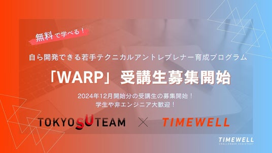 株式会社TIMEWELL(本社:神奈川県横浜市、代表取締役:濱本隆太、以下TIMEWELL)は、東京都と多様な主体によるスタートアップ支援展開事業「TOKYO SUTEAM」の協定事業者として、事業支援やアプリ開発、登記や実証実験まで、一部費用も含めてサポートし自ら開発できる、若手テクニカルアントレプレナー育成プログラム「WARP」※(以下WARP)の受講生の募集を開始します。2024年12月~2026年3月までの期間で約2ヶ月の講座を計5回開催します。2024年11月3日から12月開始分の受講生の募集を開始いたします。