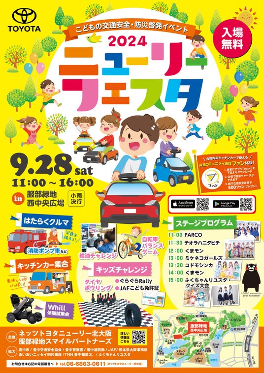 レクストホールディングス株式会社(本社:大阪府大阪市中央区、代表:十河 良寿)の子会社でキッズリユース事業「ふくちゃんリユスタ」を運営する株式会社REGATE(本社:大阪府大阪市中央区、代表:福島 道子)は、ネッツトヨタニューリー北大阪株式会社(本社:大阪府豊中市稲津町、代表:小西 敏仁)および、大和リース株式会社(本社:大阪府大阪市中央区、代表:森田 俊作)が代表を務める「服部緑地スマイルパートナーズ」が主催する、こどもの交通安全・防災啓発イベント「2024ニューリーフェスタ」に初めて参加します。イベントは9月28日(土)に服部緑地 西中央広場で開催され、「ふくちゃんリユスタ」はリユースの大切さを楽しく学べる二つのブースを出展し、ステージイベントも実施します。