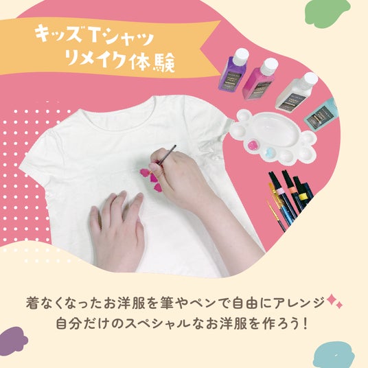 キッズTシャツリメイク体験ご家庭からお持ちいただいたTシャツを、ペンやステンシルなどで自由にアレンジしていただけるブースです。親子でご参加可能で、作成したTシャツはイベント内でご着用いただけます。なおTシャツをお持ちでない方は、当日リユース品のTシャツを1枚200円でご購入いただけます。