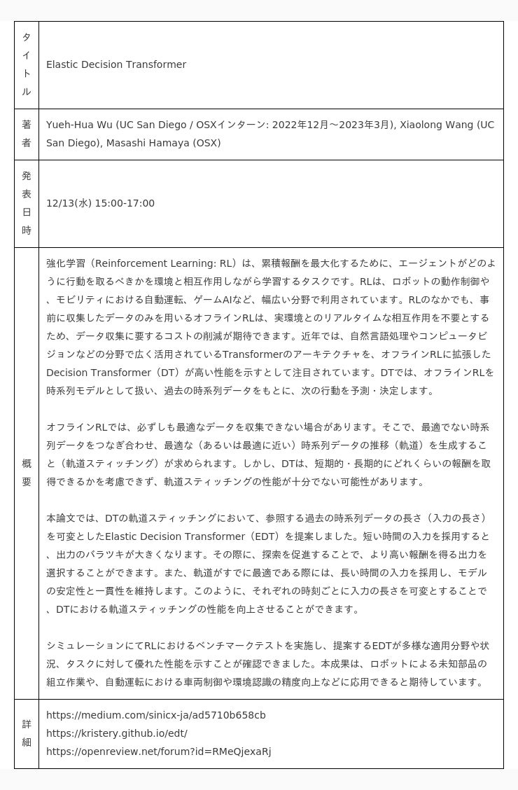 NeurIPS 2023に採択された論文では、オフライン強化学習において、学習時に最適な時系列データを収集できていない場合においても、最適に近い時系列データを生成するアルゴリズムを検討し、その成果をまとめています。また、ワークショップでは、科学的な新発見の促進を目的とした、データから数式を探し出すTransformerモデルの研究について発表します。これらを、社会実装に向けて積極的に活用いただくために、わかりやすく技術を解説する記事やGitHubでオープンソースコードとして公開しています。詳細は、論文内容のリンクからご確認ください。