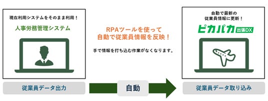 これにより、両システムに社員情報を登録する入力作業や整合性のチェックを行う手間を省くことができ、「ピカパカ出張DX」を人事労務管理システム上で更新した最新の状態でご利用いただくことが可能となります。