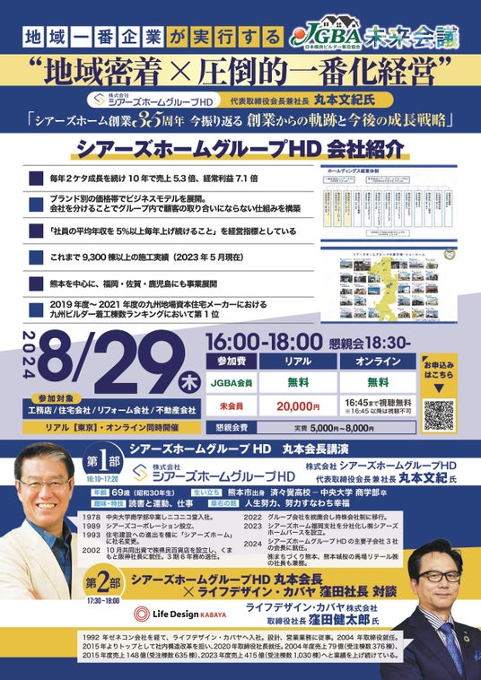 「リアル」にこだわった学びの機会を積極的に提供している一般社団法人日本優良ビルダー普及協会(事務局:東京都港区、会長:ライフデザイン・カバヤ株式会社 取締役社長 窪田健太郎、以下「JGBA」)では、会員企業の積極的な情報共有と交流機会創出のため、セミナーや勉強会、会員会社の現地視察ツアーを開催しています。特に“未来会議”と題したセミナーは、住宅業界で実際に成功されている経営者を講師にお迎えし、実際に取り組んでいる事での失敗や成功談、良質な情報の提供と交換の場が会員企業を筆頭に人気を博しているため、継続的に実施しております。過去、BETSUDAI Inc. TOKYO CEO 林哲平氏(本社:東京都港区)、株式会社マエダハウジング 代表取締役 前田政登己氏(本社:広島県広島市)、I.Compass株式会社 代表取締役 西尾肇氏(本社:東京都渋谷区)他多数にご登壇いただき、今回株式会社シアーズホームグループHD 代表取締役会長兼社長 丸本文紀氏(本社:熊本県熊本市)を講師にお迎えし、リアルとオンラインの同時開催を予定しております。(セミナー概要は下記に記載がございます)