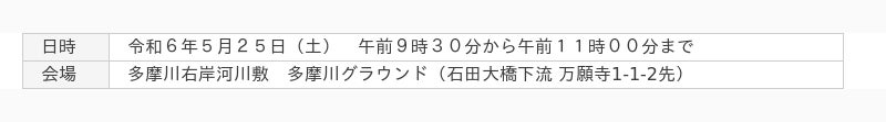 令和6年5月25日(土)水防法の規程に基づき、東京消防庁、警視庁、陸上自衛隊、日野市消防団、日野市災害対策協力会、日野市などの参加により令和6年度日野市合同水防訓練を実施します。