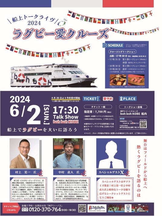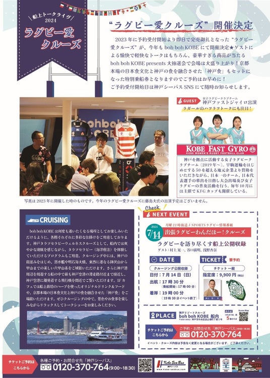 神戸シーバスboh boh KOBEでは6月2日(日)に2度目となる、船上トークライヴ『ラグビー愛クルーズ2024 船上でラグビーを大いに語ろう!』を開催します。
