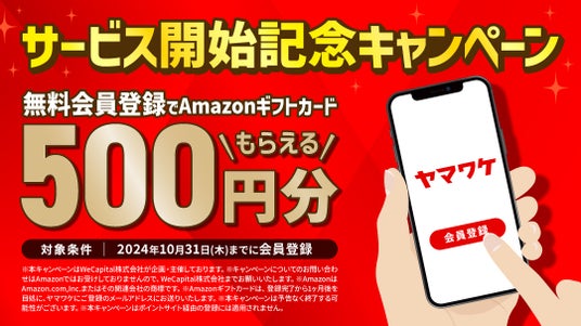 サービス開始を記念して、ただいまヤマワケにご登録いただいた方に500円分のAmazonギフトカードをプレゼントいたします。会員登録いただきますと、いち早く案件情報をお送りさせていただきます。LINE等の公式SNSもあわせてぜひご登録ください。