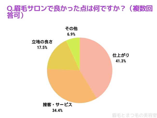 武蔵小杉駅を利用している人に、眉毛サロンで良かった点をお聞きしたところ「仕上がり(41.3%・78票)」、「接客・サービス(34.4%・65票)」、「立地の良さ(17.5%・33票)」、「その他(6.9%・13票)」という結果になりました。