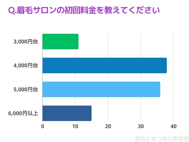 武蔵小杉駅を利用している人に、眉毛サロンの初回料金をお聞きしたところ「3,000円台(11%)」、「4,000円台(38%)」、「5,000円台(36%)」、「6,000円以上(15%)」という結果になりました。