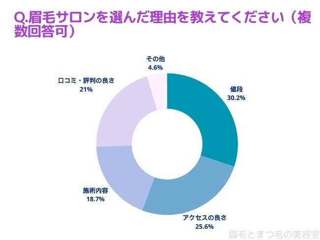 眉毛サロンを選んだ理由は、値段がトップということが分かりました。次いで口コミ・評判、アクセスの良さ、施術内容と続きました。SNSを通じて知り合ったスタッフがいるところを予約したという声もあり、現代特有の選び方も珍しくないようです。