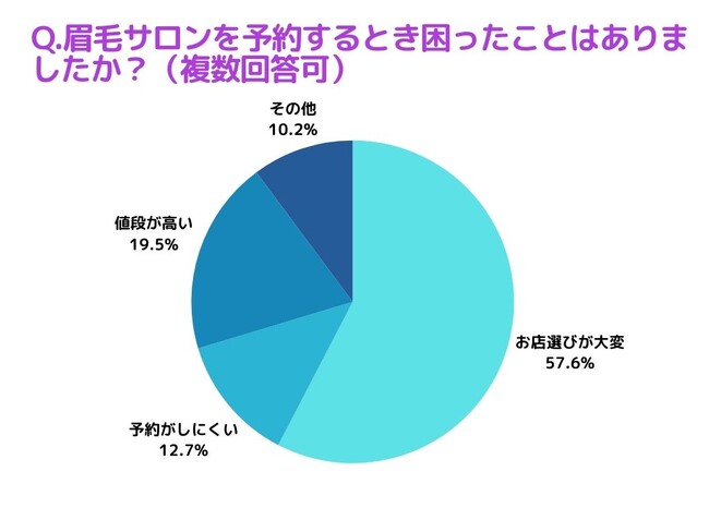 眉毛サロンを予約するときに困ったことは、お店選びという声が多かったです。都市部は人が多いせいか、人気のサロンは予約を取りにくい傾向があります。また、値段の高さが気になるという声もありました。