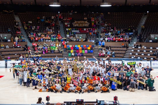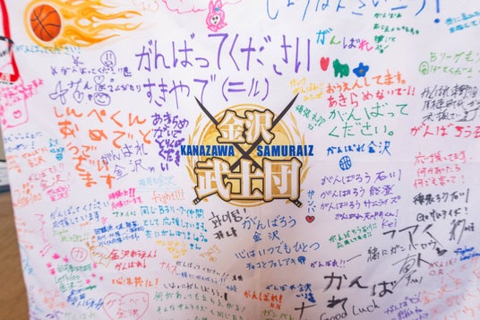 こちらも大いに盛り上がり、約37チームのブースターの方々が会場に駆けつけました。さらに2日目には急遽、金沢武士団のビッグフラッグをユニフォームで囲って応援しようというアイデアも加わり、会場は多くのチームユニフォームで彩られバスケットボールのパワーを感じさせられました。