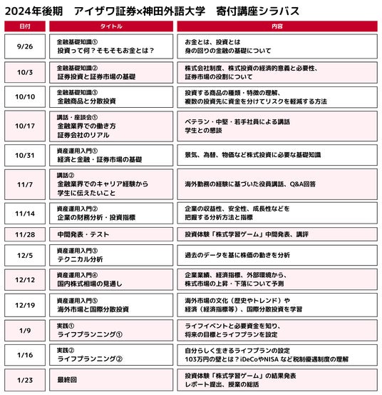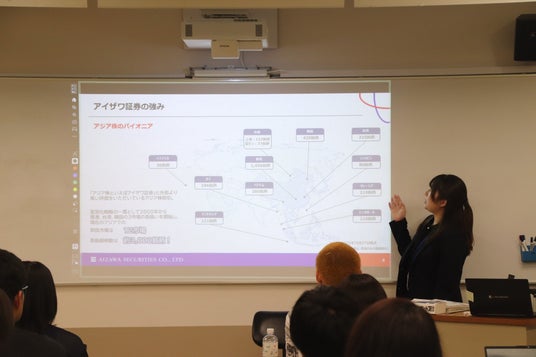 アイザワ証券株式会社(本社所在地:東京都港区、代表取締役社長:藍澤 卓弥、以下「当社」)は2024年9月より学生の金融リテラシー向上に向けた取組みの一環として神田外語大学(本校所在地:千葉県千葉市、学長:宮内 孝久)にて寄付講座を実施しております。