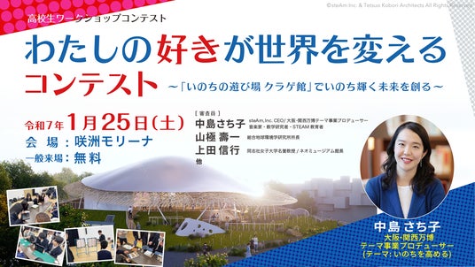 株式会社steAm(代表取締役 中島さち子:東京都豊島区)が、大阪府教育庁の委託を受け開発した「STEAM教育プログラム」。その一環として推進している「わたしの好きが世界を変える!」企画として、現役高校生が中島さち子のプロデュースするシグネチャーパビリオン「いのちの遊び場 クラゲ館」にて来場者に向けてワークショップを実施するチャンスを提供、出場者の最終審査を2025年1月25日(土)に、咲洲モリ-ナにて開催します。