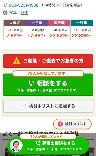 直接連絡:コールセンターなどを介さず、利用者が葬儀社と直接電話で話せます。これにより、迅速な対応が可能なだけでなく、実際に話してみることで葬儀社の対応の質や雰囲気を自分自身で確かめられます。また、気になる料金やサービス内容について遠慮なくその場で質問できるため、より具体的な情報を得られます。
