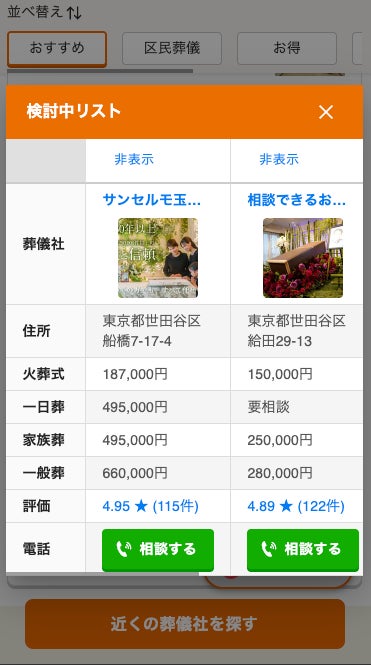 気になった葬儀社を最大5社まで「検討リスト」に追加でき、基本プラン料金、口コミ評価、住所などの重要項目を一覧表で比較できます。