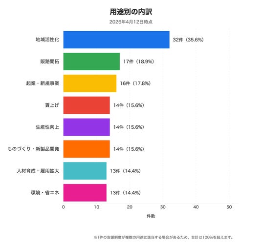 起業・新規事業(16件)や賃上げ(14件)、生産性向上(14件)もほぼ同水準で並んでおり、地域活性化テーマの制度の中に創業支援や従業員の処遇改善まで対応するものが多い構成です。販路開拓(17件)と組み合わせて活用できる制度を選べば、商品開発から販路拡大まで一続きの投資を1回の申請でカバーできるケースがあります。
