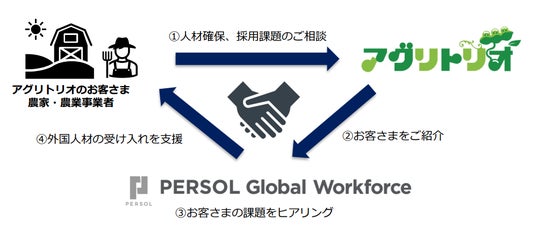本業務提携は、アグリトリオのお客さまが抱える外国人材の受け入れ・定着などに関する課題に合わせ、PERSOL Global Workforceの外国人材に関する各種サービス(派遣、紹介、定着など)を提案・提供するものです。
