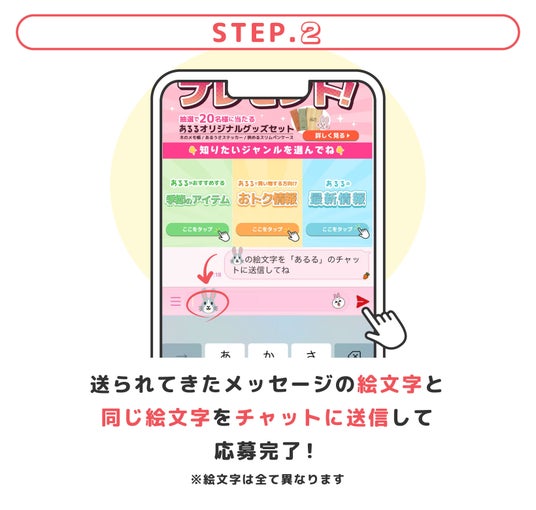 - 送られてきたメッセージの絵文字と同じ絵文字をあるるモール公式LINEのチャットに送信したら応募完了!