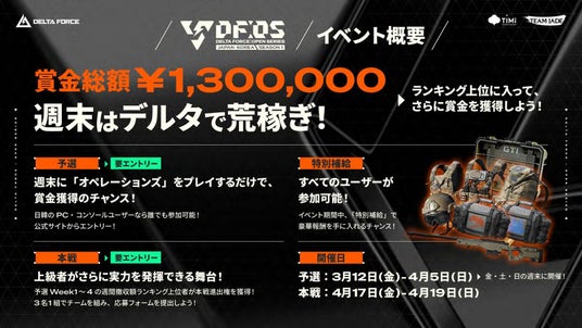 高品質なタクティカルFPSタイトルを手掛けるTeam Jadeは、2026年3月より、公式イベント「Delta Force: Open Series」を開催することを発表しました。本イベントは、賞金総額130万円が用意されたランキング形式の公式イベントとして実施されます。