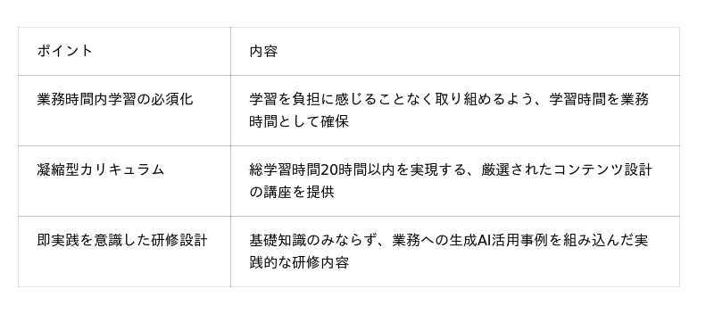 ペイロールは、これまでの給与計算サービスの枠にとどまらず、「HR AI Tech Company」としてサービスを進化させていくことを経営戦略の柱に据えています。併せて、生成AIやAIエージェントを日常業務にも活用し、全社員がイノベーションを生み出す文化を醸成することも重要視しており、この組織文化実現に向けた基礎知識習得を促進する目的で今回の支援に至りました。