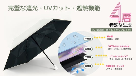 赤外線・可視光線を物理的に遮断し、傘下では最大−20℃の遮熱効果を発揮。猛暑の中でも「歩く木陰」のような涼しさを提供します。