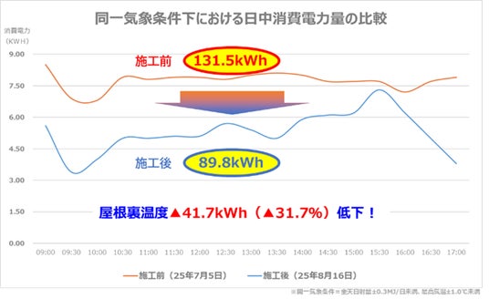 ました。更に空調の消費電力においても、同一気象条件下(全天日射量±0.3MJ/日、最高気温差±1.0℃未満)で比較したところ、塗装前後で最大31.7%、平均18.1%(5 ケース)の低減が確認されました。