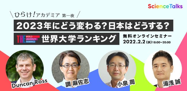 日本の科学分野を活気づけるための科学メディア兼コミュニティプラットフォームであるScience Talksは、アカデミアをより身近に親しみやすく感じていただきたいという願いから新たなプロジェクト、「ひらけ!アカデミア」を発足いたしました。「ひらけ!アカデミア」では、今後毎週学界や研究に関するイベントを開催いたします。その幕開けとなる第1夜が「2023年にどう変わる?日本はどうする?THE世界大学ランキング」です。