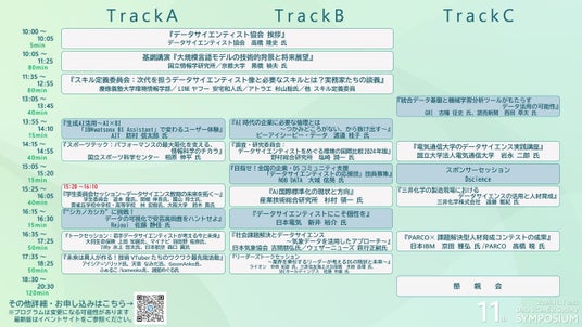 注目のセッションとして、技術VTuberの世界からデータサイエンスVTuberのアイシア=ソリッド氏、民俗学VTuberの諸星めぐる氏、生成AIとVTuberの共生を目指しAIとの合作曲など新しい表現を発信している天音なみだ氏、VR空間内で自律的に動く機械知能を開発する げそん氏、VR空間内で開催する学会を運営する ふぁるこ氏をお招きし、最先端の活動についてお話しいただきます。また、毎年好評のトークセッション「若手データサイエンティストが考える今と未来」では、様々な業界の若手データサイエンティストが、データサイエンティストを目指したきっかけやリアルな業務についてインタラクティブな質疑応答を踏まえ議論します。その他スポンサー企業による、企業側の具体的なデータサイエンスの取り組みのセッション他、業界最前線のスピーカー総勢34名による講演を予定しています。