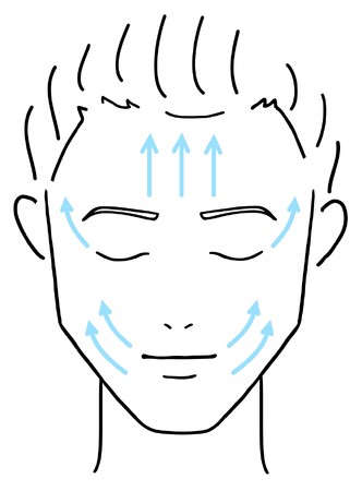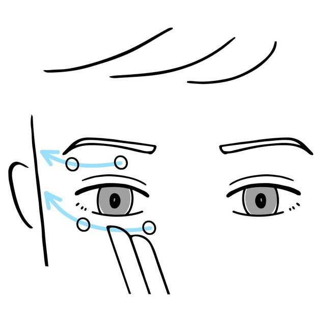 3.目頭からこめかみに向かって、引き上げるようにゆっくりやさしくのばします。この時、指腹全体を使って広い範囲に伸ばします。
