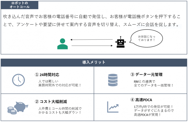 ロボットのオートコールは、これまでコールセンターで行っていた基本のカスタマー業務に加え、商品購入後の顧客フォローや、督促通知、顧客アンケートなど CRM 領域でも幅広く活用することを想定しています。まさに、今まで人の手が回らなかった部分をロボットがきめ細やかな“おもてなし”を行うことで顧客満足度の向上を図り、さらには人件費や架電時間の削減でコストも大幅に効率化させるソリューションです。