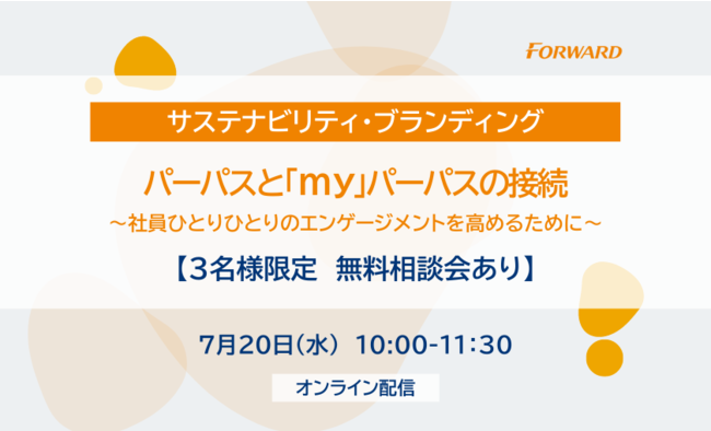 企業のブランド戦略を支援する株式会社フォワード(本社:東京都中央区、代表取締役:伊佐 陽介)は、無料セミナー『パーパスと「my」パーパスの接続』を2022年7月20日(水)にオンラインにて開催致します。(詳細・お申込みはこちらから:https://www.forward-inc.co.jp/seminar/2022/07/20)