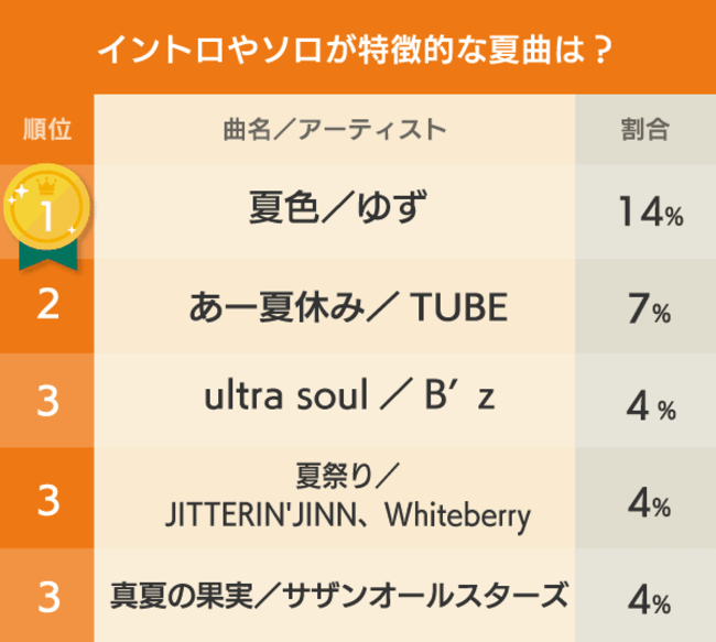 イントロやソロが特徴的な夏曲のランキングでも『夏色』が1位となりました。その理由としては「最初のイントロがきれい」「アコギのイントロが印象的」「一連のイントロが元気な夏をイメージさせる」「楽しくなり盛り上がる」等が挙げられ、この曲のイントロを聞くと夏を連想するという意見が多くありました。