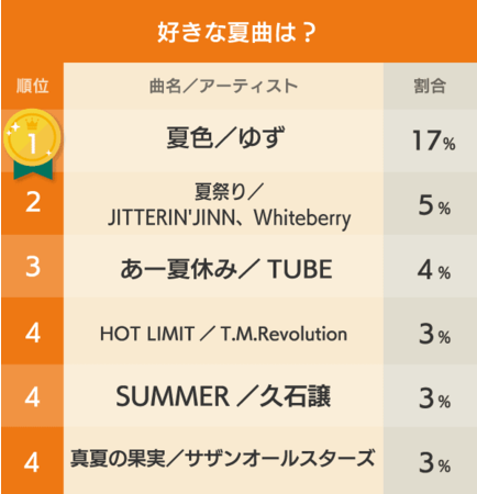 第1位『夏色(ゆず)』17%、第2位『夏祭り(JITTERIN'JINN/Whiteberry)』5%、第3位『あー夏休み(TUBE)』4%