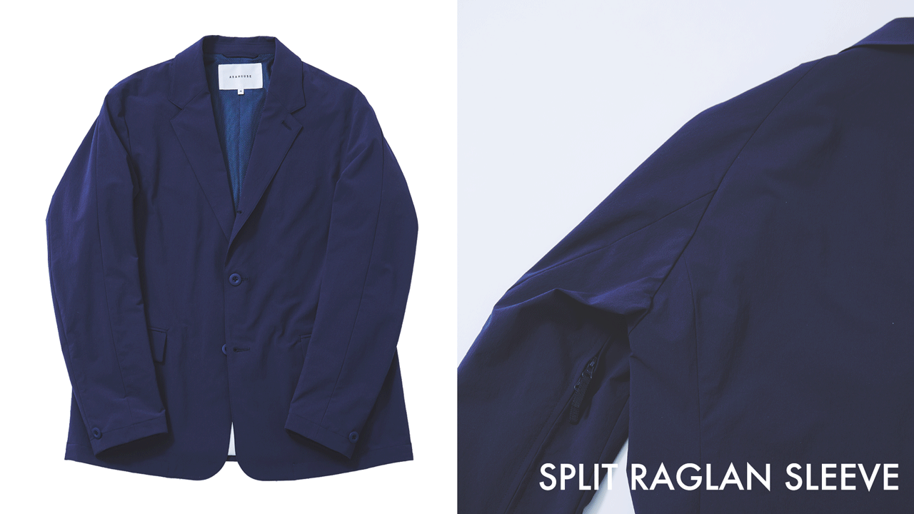 ジャケットはスプリットラグラン仕様にすることで自転車に乗っている時に腕を前に伸ばしても肩口にストレスがかかりにくく、袖もライディング姿勢に合わせて前振りのパターンを採用。袖下には体熱を逃がし、風通りを良くするためのベンチレーションを備えています。防風性を高めるために襟を立ててフロントを閉じることが可能で、背面の両サイドに配された横ポケットはライド中に使用しやすい角度を追求するなど細かなニーズにも対応。