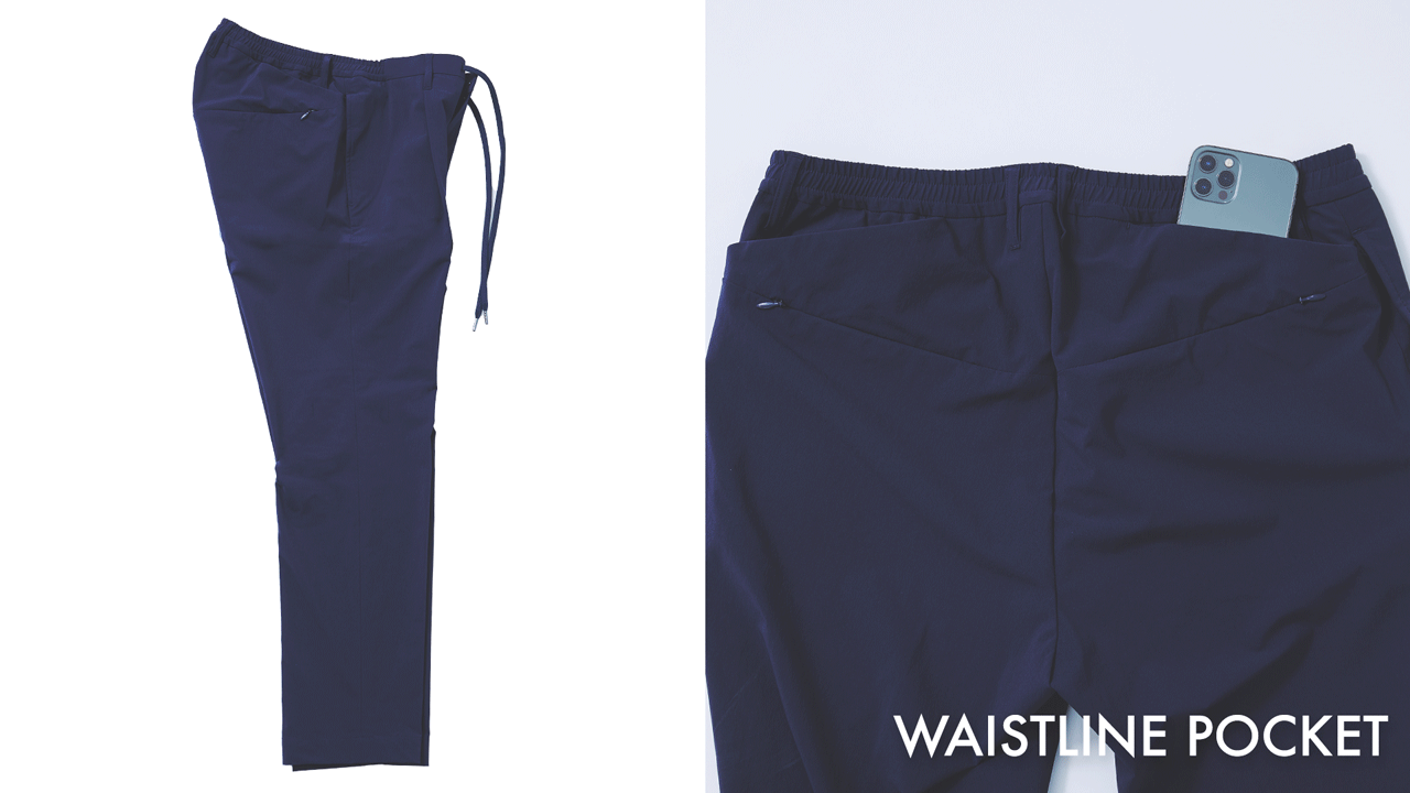 ボトムスはベルトレスでも着用可能なイージーテーパードタイプで、少し腰と太もも部分にゆとりをもたせたワンタック仕様。きちんとクリースラインが入っているためビジネスシーンにも対応します。ライディング姿勢ではヒップポケットにものが入れづらいことを考慮して腰の部分にポケットを設置、スマートなシルエットと機能性の両立を実現しました。夜間走行時には車道側となる右足の裾を折り返すと3M社のリフレクターが現れます。