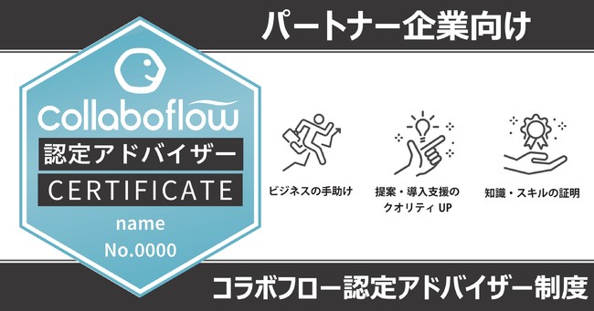 コラボフローの販売を行うパートナー企業向けのコラボフロー認定資格です。後述する「コラボフロー認定資格」試験に合格していただくと、「コラボフロー認定アドバイザー」に認定され、資格保持を証明する認定証をお贈りします。