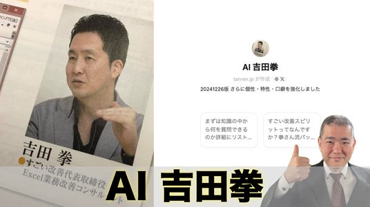 2024年12月26日、TANREN株式会社(本社:東京都千代田区、代表取締役 CEO:佐藤勝彦、以下:TANREN)は、Excel業務効率化の第一人者であり、著書累計50万部超を誇る吉田拳(よしだ・けん)氏(株式会社すごい改善 代表取締役)との共同プロジェクトとして、Excel・VBAを用いた業務改善ノウハウをAIに実装した新エージェント「AI 吉田拳」をリリースいたしました。本取り組みは、先行してリリースした「AI 伊藤羊一」に続く第2弾となります。